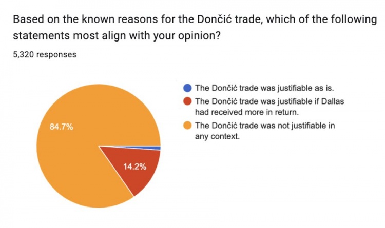 参与问卷调查的5320名球迷中,84.7%的球迷认为东契奇交易在任何情况下都说不过去,14.2%的球迷认为如果独行侠获得更多的回报,那么东契奇交易说得过去,认为东契奇交易说得过去的球迷只占1.1%。