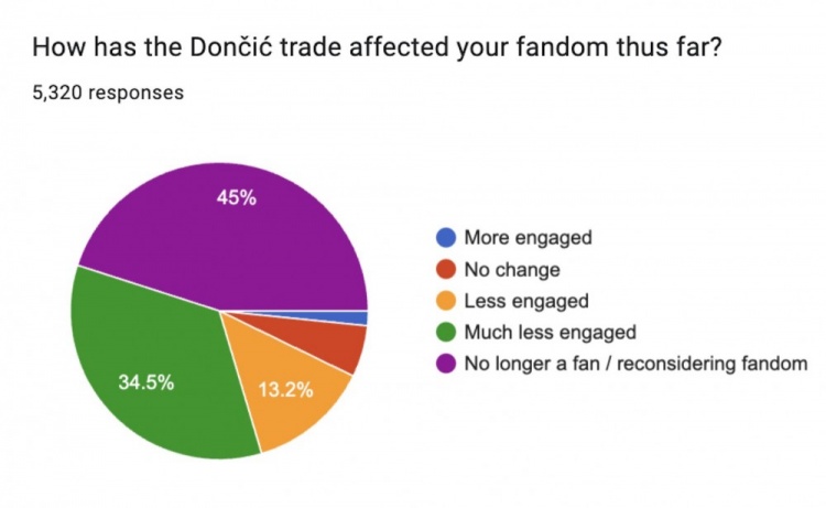 在东契奇交易如何影响你对球队的喜爱这个问题上?45%的球迷表示不再是一名球迷或者要重新考虑自己的喜爱程度;34.5%表示自己现在参与度低多了,13.2%的球迷表示自己参与度略有降低,只有7.3%的球迷表示自己的喜爱度没有变化或者参与度更高了。