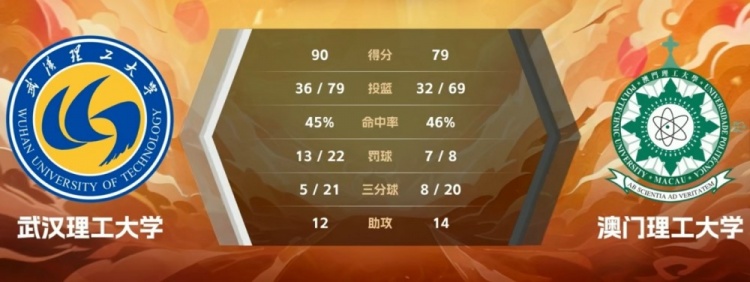末节决战,王鹏翼攻防建功帮助武汉理工一度领先到双位数,何浩然补篮止血,茹鹏宇连续突破砍下4分助澳门理工9-2小高潮再次追到差3分。王舒畅三分命中后又抢断打成反击,武汉理工回应8-0稳住局势,澳门理工无力回天,最终武汉理工90-79力克澳门理工,拿到开门红。