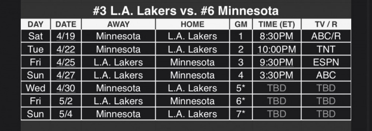湖人vs森林狼的系列赛赛程在G1和G2之间、G2和G3之间、G4和G5之间有三次为期两天的休息日。