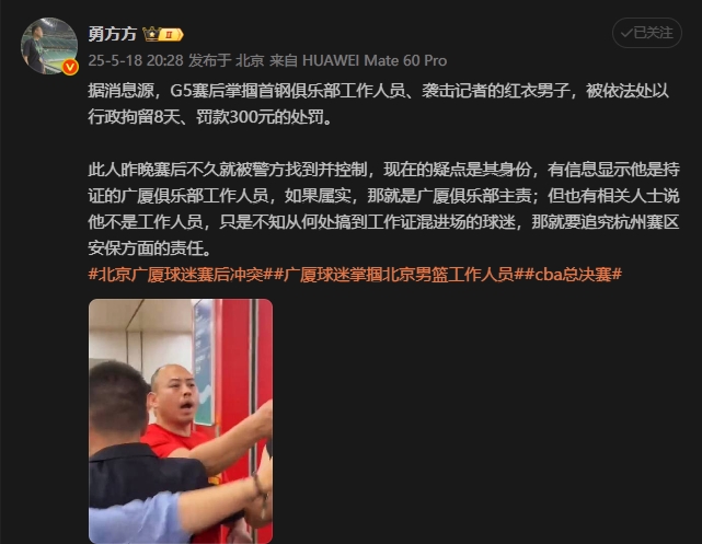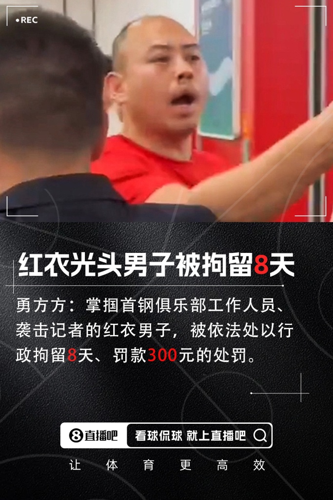 据北京记者勇方方消息源,G5赛后掌掴首钢俱乐部工作人员、袭击记者的红衣男子,被依法处以行政拘留8天、罚款300元的处罚。