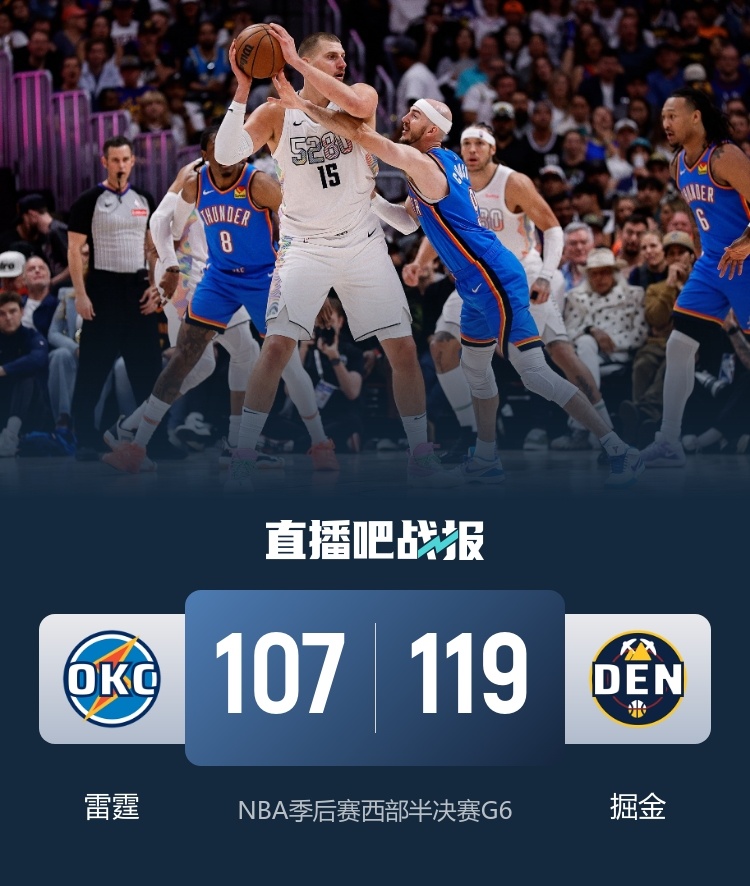 比赛开始,两队开场便陷入缠斗,比分始终紧咬,穆雷高效发挥,雷霆多点开花给出回应。约基奇传射建功带队打出9-0的攻击波,雷霆连中三分努力追赶,轮换阵容打出8-1的小高潮迫近比分,次节雷霆打出11-2完成反超,掘金进攻端陷入哑火,亚历山大连得9分率队取得两位数优势,掘金大举反击回敬12-0的高潮,半场战罢雷霆61-58领先掘金3分。易边再战,两队继续缠斗,比分始终紧咬,斯特劳瑟成为奇兵,连中三分独得8分帮助掘金打出10-0的攻击波取得两位数优势,末节双方围绕10分分差展开激烈争夺,掘金稳扎稳打完成12-5的攻势将分差拉开到16分,雷霆苦苦追赶无果。最终,掘金119-107击败雷霆,将总比分扳成3-3平拖入抢七。
