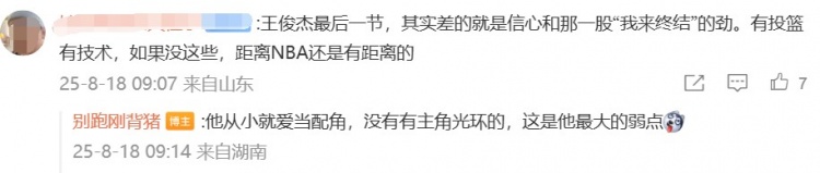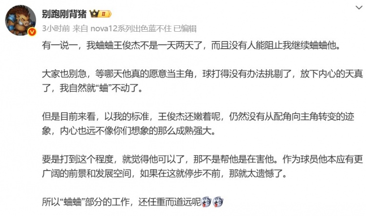 赛后,媒体人@别跑刚背猪发文谈到了王俊杰,内容如下: