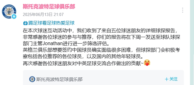 除此之外,此前一直卡住中国球员前往英国踢球的劳工证问题也不用担心。这家俱乐部在邮件中明确表示,他们愿意贡献队内仅有的2个ESC名额(无须劳工证的外卡)之中的一个,来引进王钰栋。