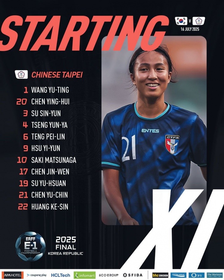 中国台北女足首发:1-王郁婷、20-陈英惠、3-苏芯芸、4-曾筠雅、9-许翊筠、6-邓霈璘、10-松永早姫、17-陈妗文、19-苏育萱、21-陈昱嫀、22-黄可欣