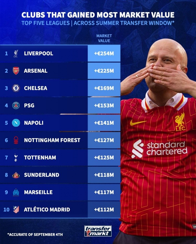 夏窗后球队身价涨幅榜:利物浦+2.54亿欧居首,枪手第二蓝军第三