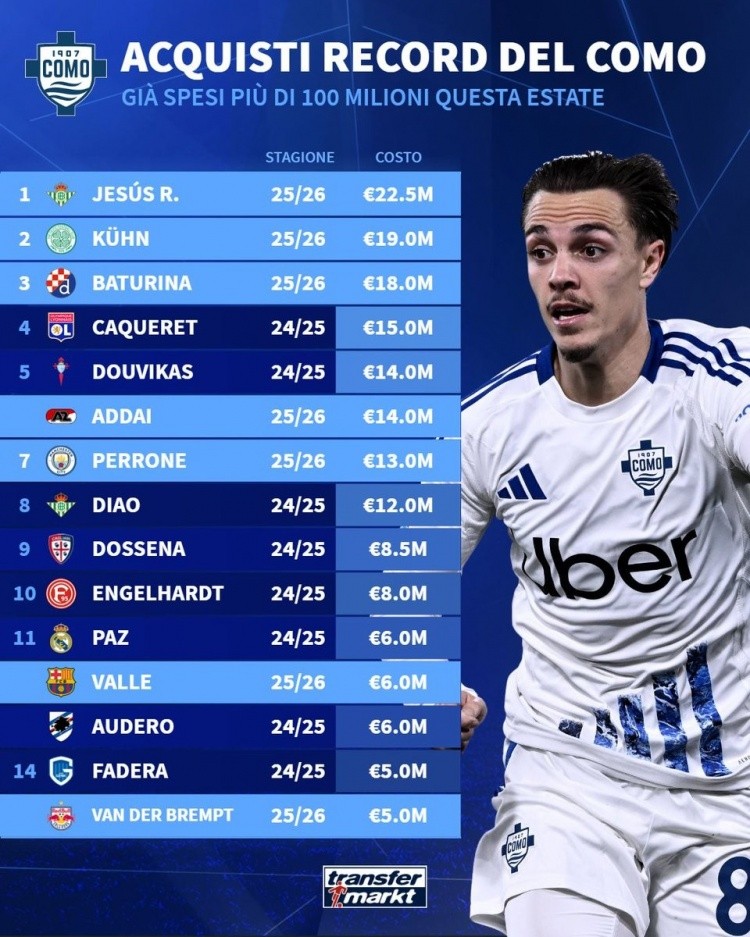 7月18日讯 德国转会市场盘点了科莫队史引援排行,今年夏天已花费超过1亿欧。1、热苏斯-罗德里格斯:2250万欧,25/26赛季,贝蒂斯→科莫2、...
