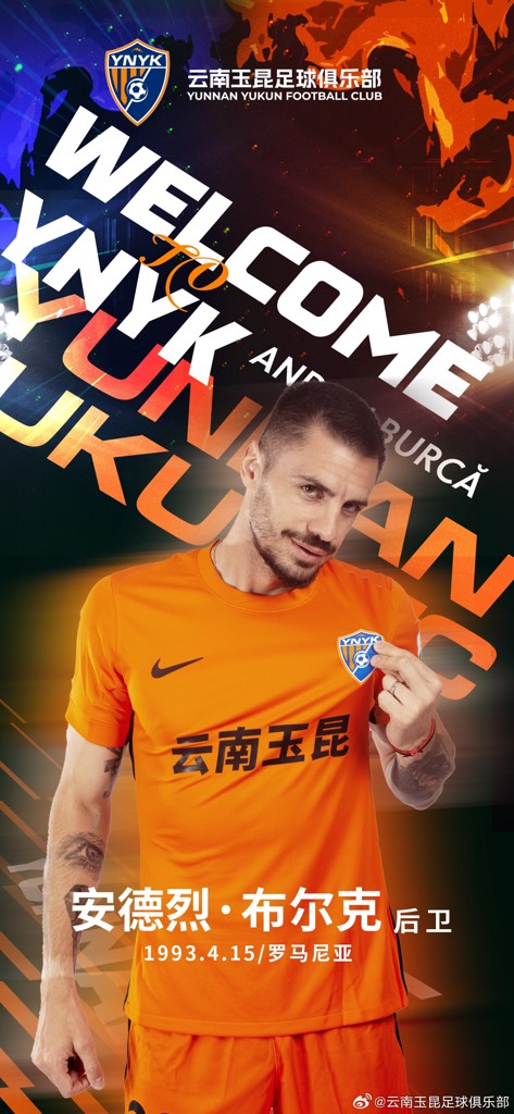 官方:云南玉昆签下罗马尼亚国脚中卫布尔克,球员身价250万欧