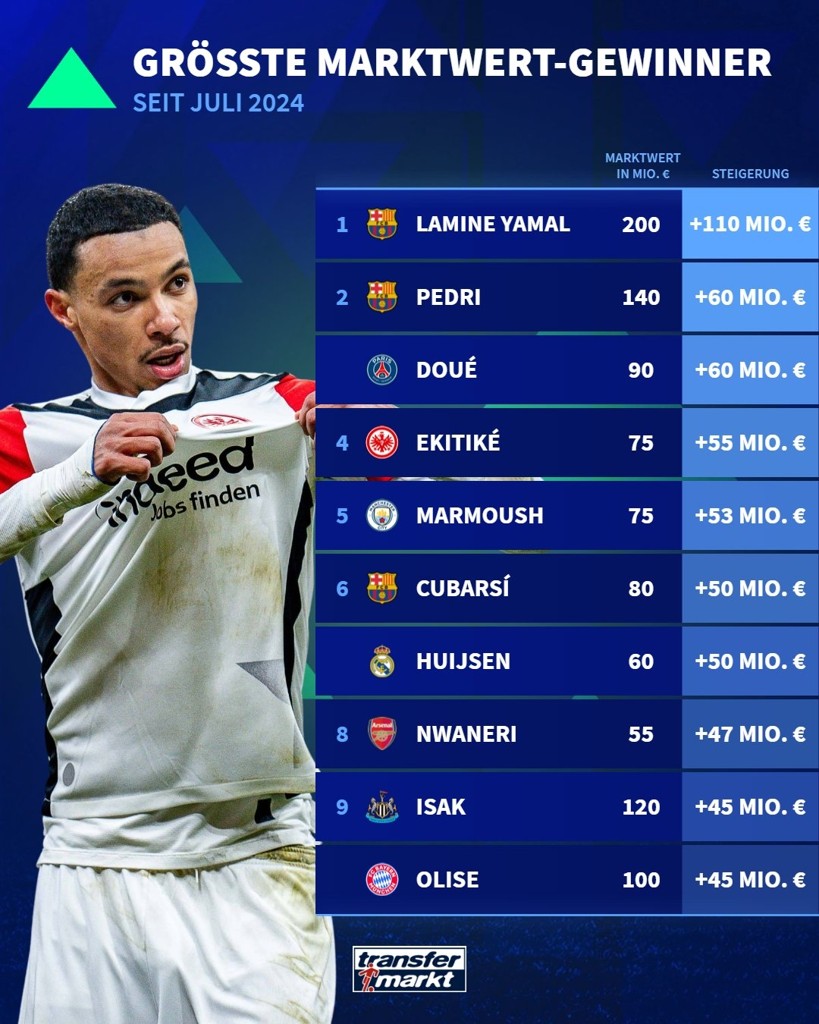 06月23日讯 德国足球转会市场近日分别列出了2024/25赛季中,身价增长/下跌最多的十名球员,亚马尔增长1.1亿欧排名榜首,福登则下跌5000万...