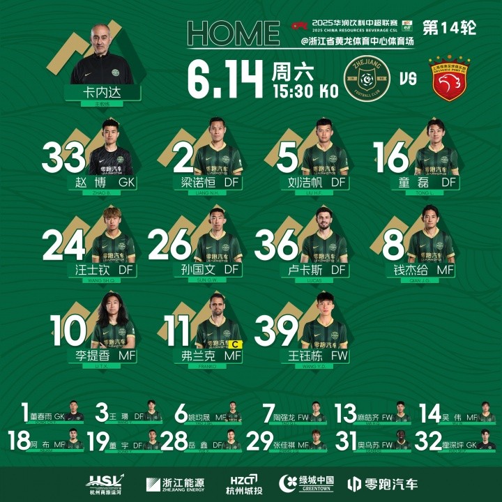 06月14日讯 中超第14轮浙江vs上海海港今日15:30进行,两队公布首发阵容,2外援vs4外援,武磊伤缺。浙江队首发:33-赵博、2-梁诺恒、5-刘浩...