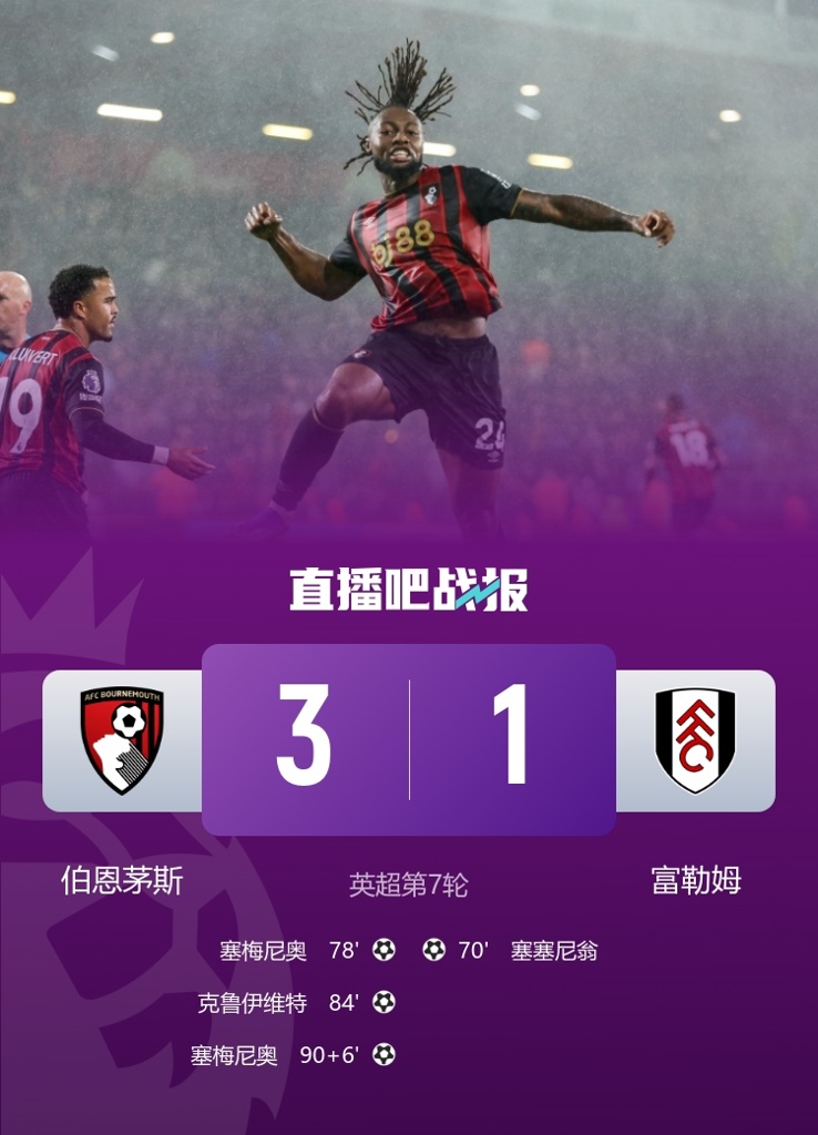 10月04日讯 今天凌晨英超第7轮先赛一场,伯恩茅斯主场3-1力克富勒姆,联赛近6轮不败暂升至积分榜第2位。今年夏天,伯恩茅斯的后防线被各大...