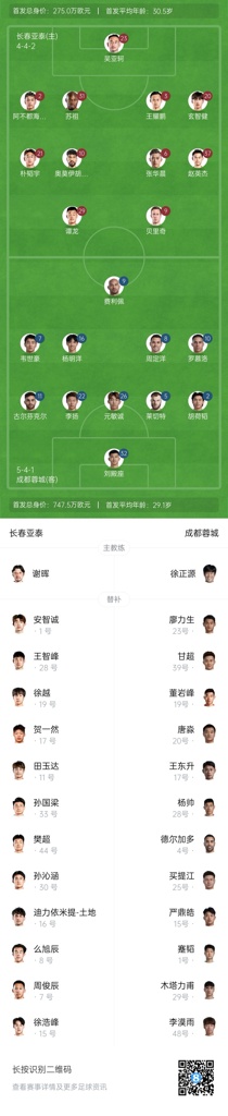 亚泰vs蓉城首发:谭龙、19岁玄智健先发,韦世豪、胡荷韬出战