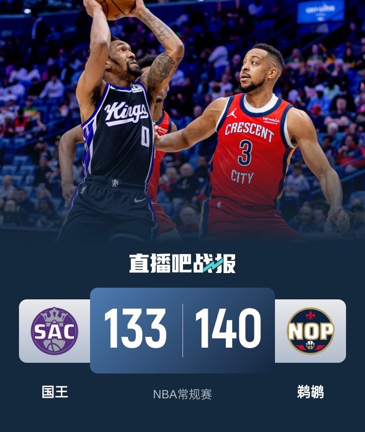 开场后两队就打得大开大合,鹈鹕手感不错率先取得领先,国王大量尝试外线三分,他们靠着不错的三分命中率将比分追上,第一节尾声国王连续断球反击将比分反超。第二节上来鹈鹕先冲击内线夺回领先,随后两队陷入僵持,场上比分也是交替上升,拉文单节得分上双帮助国王在半场结束前保住优势。易边再战,麦科勒姆突然爆发,他第三节单节轰下21分帮助鹈鹕将比分反超。第四节上来鹈鹕一度扩大领先优势,厄尔三分弹无虚发,但萨博尼斯和德罗赞联手帮助国王将比分追上,但关键时刻德罗赞连续进攻不中,麦科勒姆关键抛投打进,蒙克拿到关键前场篮板造成布朗犯规,随后两罚全中拖入加时。加时赛中麦科勒姆手感火热接连砍分帮助鹈鹕拿下胜利,最终鹈鹕加时140-133力克国王结束10连败,国王3连胜被终结。
