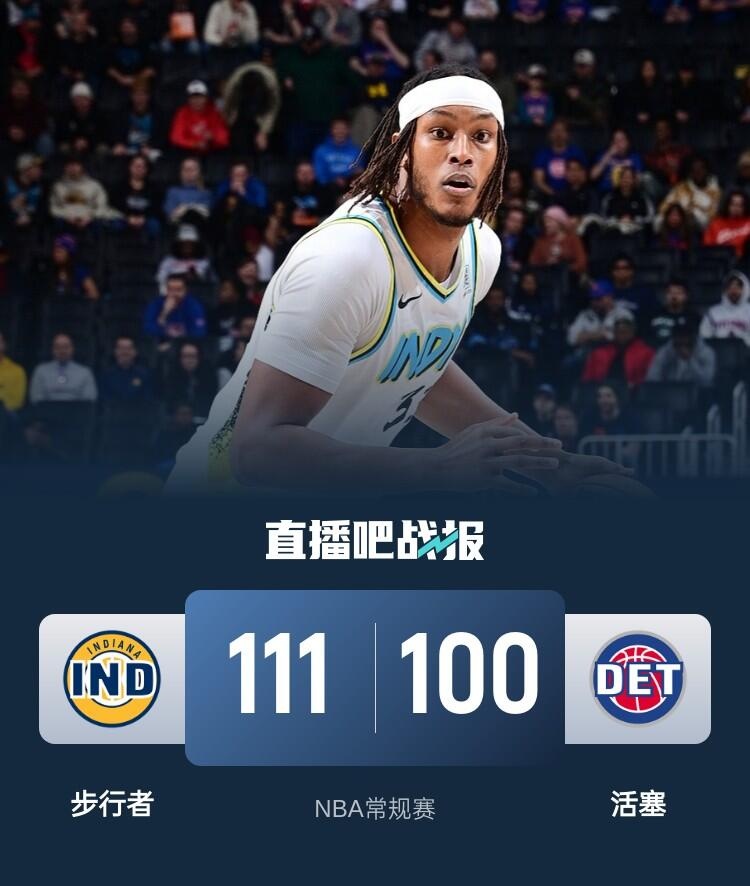 上半场,双方开场势均力敌,小哈达威连中3记三分,特纳高效输出还以颜色,次节步行者火力全,多点开花单节轰下40分,半场战罢步行者69-53领先活塞。下半场,步行者占得先机一度将分差拉开到20分,活塞利用反击迅速迫近比分,末节活塞一度迫近比分,但连续失误打铁,步行者稳扎稳打收下胜利。最终,步行者111-100击败活塞。