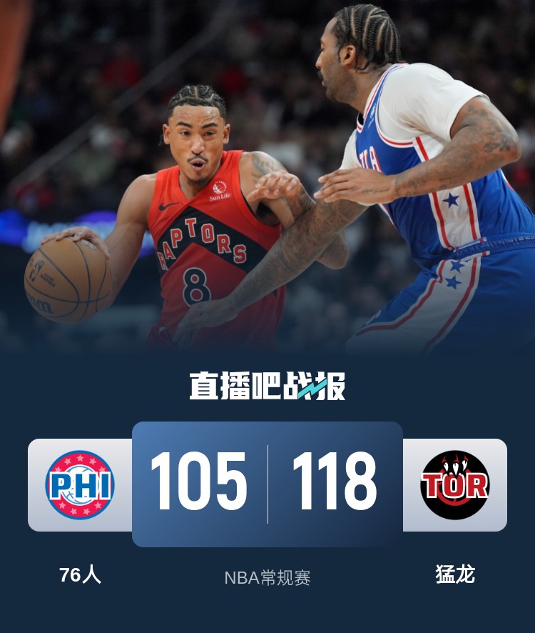 比赛上来,两队就打得十分胶着,场上比分交替领先,到了次节双方开始大打对攻战,但明显猛龙的攻势更加凶猛,他们单节轰下40分将分差拉开到两位数,半场结束时76人落后14分;下半场回来,猛龙的进攻表现明显下滑,76人抓住机会将比分追了上来,不过末节76人再次断电,猛龙轰出一波12-2的攻势将分差拉开到两位数,比赛也就此失去悬念,最终猛龙力克76人获得连胜。