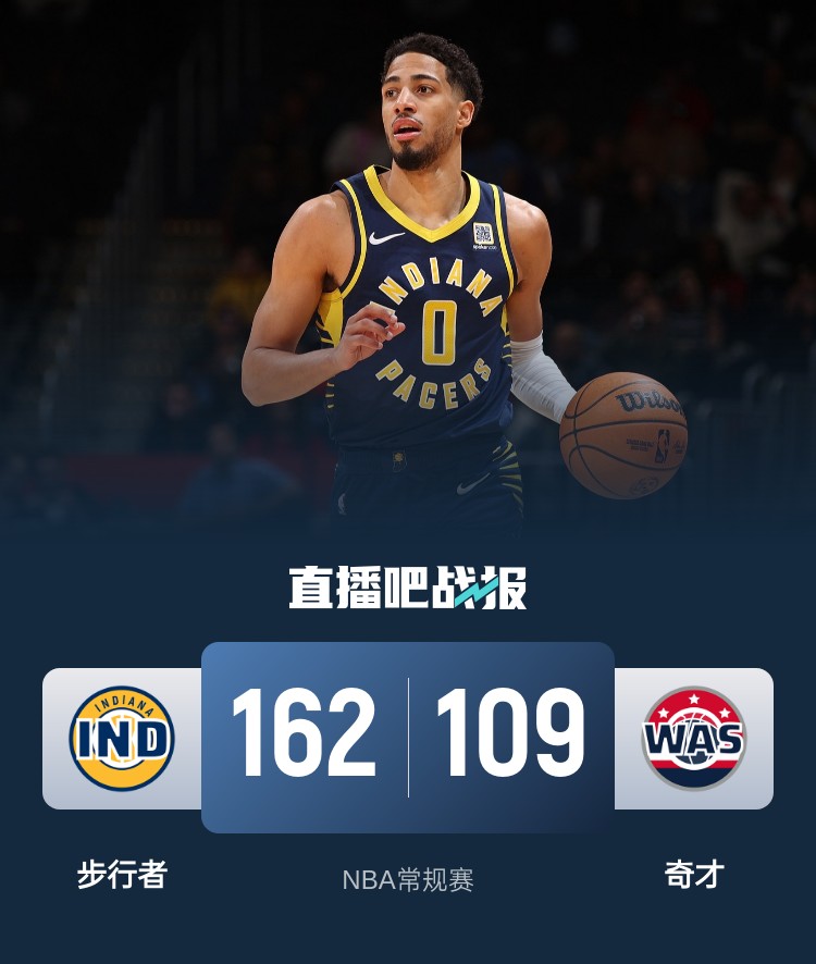 开场后步行者就展现出火热状态以8-0开局,奇才毫不示弱咬住比分,哈利伯顿外线爆发连中三分带领步行者又是一波12-0的攻势将分差拉大到两位数,萨尔状态也不错但难以帮助奇才扭转局面。第二节步行者轮换阵容攻势依旧凶猛将领先优势拉大到20分以上。易边再战,步行者依旧是火力全开,特纳也接连轰进三分,虽然萨尔表现依旧不错,但凭他一己之力完全无法阻挡步行者的发挥,三节过后步行者已经领先超过30分。最后一节彻底沦为练兵时间,步行者替补依旧表现神勇继续拉大分差,最终步行者162-109血洗奇才。