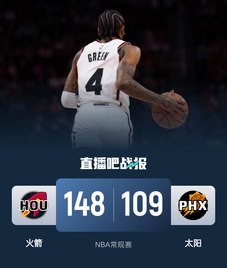 火箭(49-26):杰伦-格林33分2板2助、申京16分9板3助、范弗里特13分2板7助2断、惠特摩尔13分2板2助、阿门12分10板9助、霍勒迪11分2板1助、兰代尔11分1板2助2断、史密斯10分7板2助、狄龙8分1板1助、亚当斯6分3板、谢泼德6分2板3助2断、杰夫-格林6分2板、泰特3分2板5助2断。