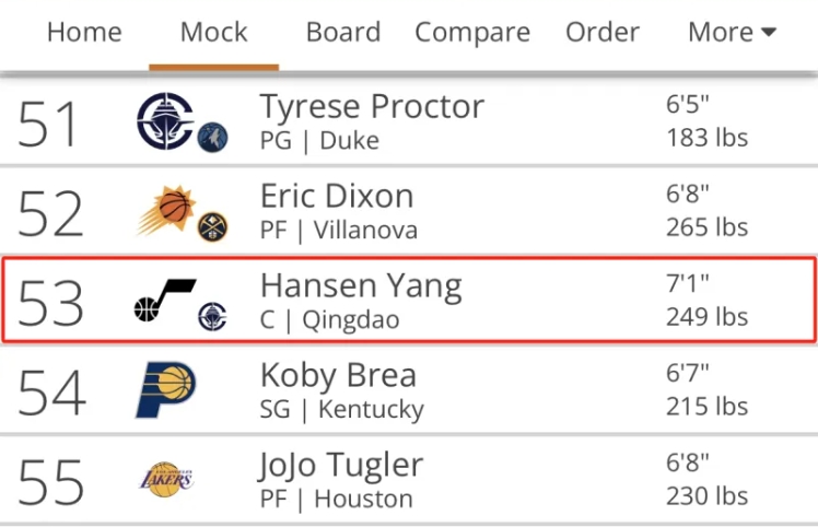 美国知名选秀网站Tankathon公布了最新一期的2025年NBA模拟选秀榜单,杨瀚森在次轮总第53顺位被爵士选中。