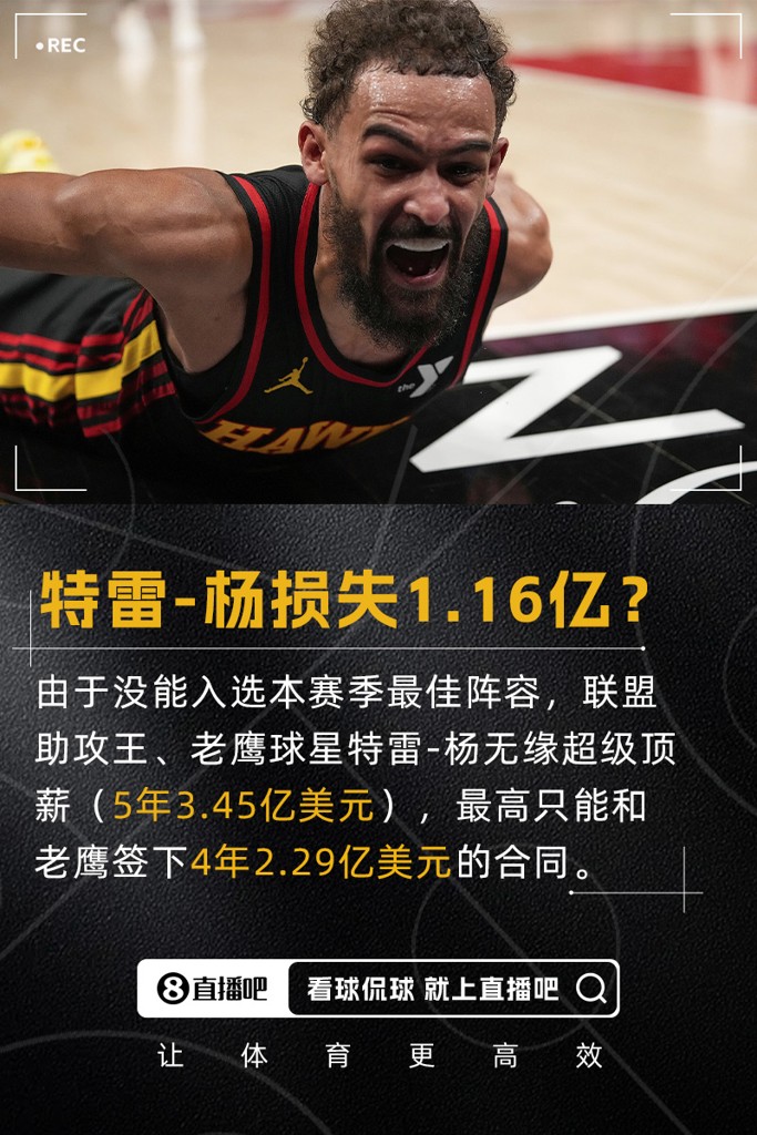 ESPN薪资专家Bobby Marks曾表示,特雷-杨有资格和老鹰签下一份4年2.29亿美元的顶薪提前续约合同。而如果他这赛季能进最佳阵容,他将拿到超级顶薪的资格,可以签下一份5年3.45亿美元的合同。而由于没能进入最佳阵容,特雷-杨无法满足超级顶薪的资格。
