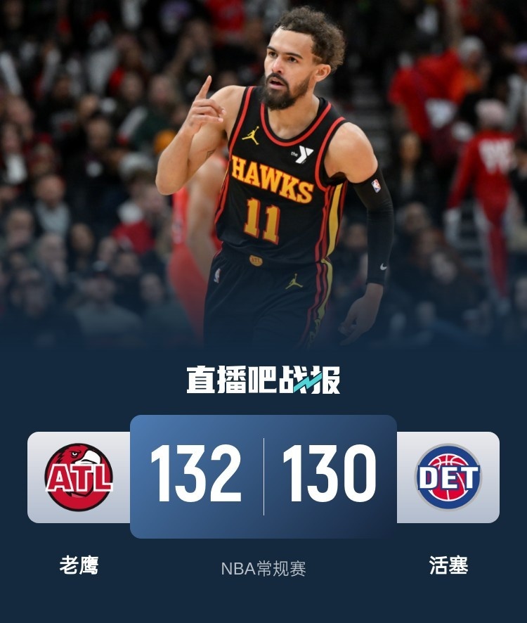 比赛开始,双方迅速进入状态,康宁汉姆连送妙传助攻队友接连4记暴扣开局,而亨特里突外投单节得分上双回应,双方对攻战活塞首节领先1分,次节吹杨接连抛投带队反超比分,随后老鹰接连外线发炮,丹尼尔斯里突外投连砍5分带队半场一度拉开双位数领先。下半场,活塞上来就是13-2进攻波反超比分,但老鹰通过罚球止血,双方外线连续对飚,比分再次胶着,三节结束老鹰还领先3分,末节老鹰12-3攻击波再次拉开双位数领先,随后老鹰松懈,活塞一波9-0小高潮一度反超比分,比赛进入白热化,CC关键失误后又强硬上篮追平,特雷-杨转身后仰压哨中投绝杀,最终老鹰132-130险胜活塞,终止8连败。