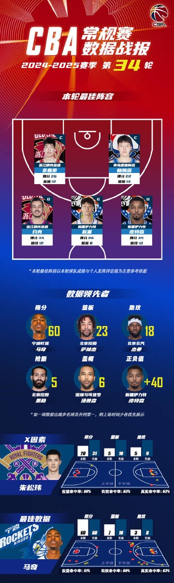 1月24日讯 今日,CBA官方公布了第三十四轮最佳阵容,余嘉豪、杨瀚森、约克、赵睿、皮特森入选。原文如下:2024-2025赛季CBA联赛常规赛第34...