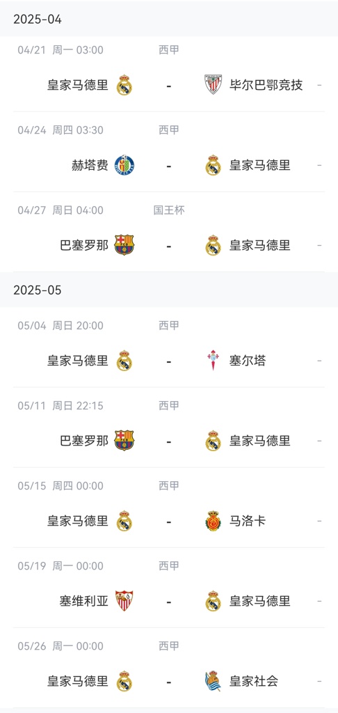 目前皇马已经从欧冠出局,球队联赛落后巴萨4分,4月27日,球队将与巴萨进行国王杯决赛的较量。