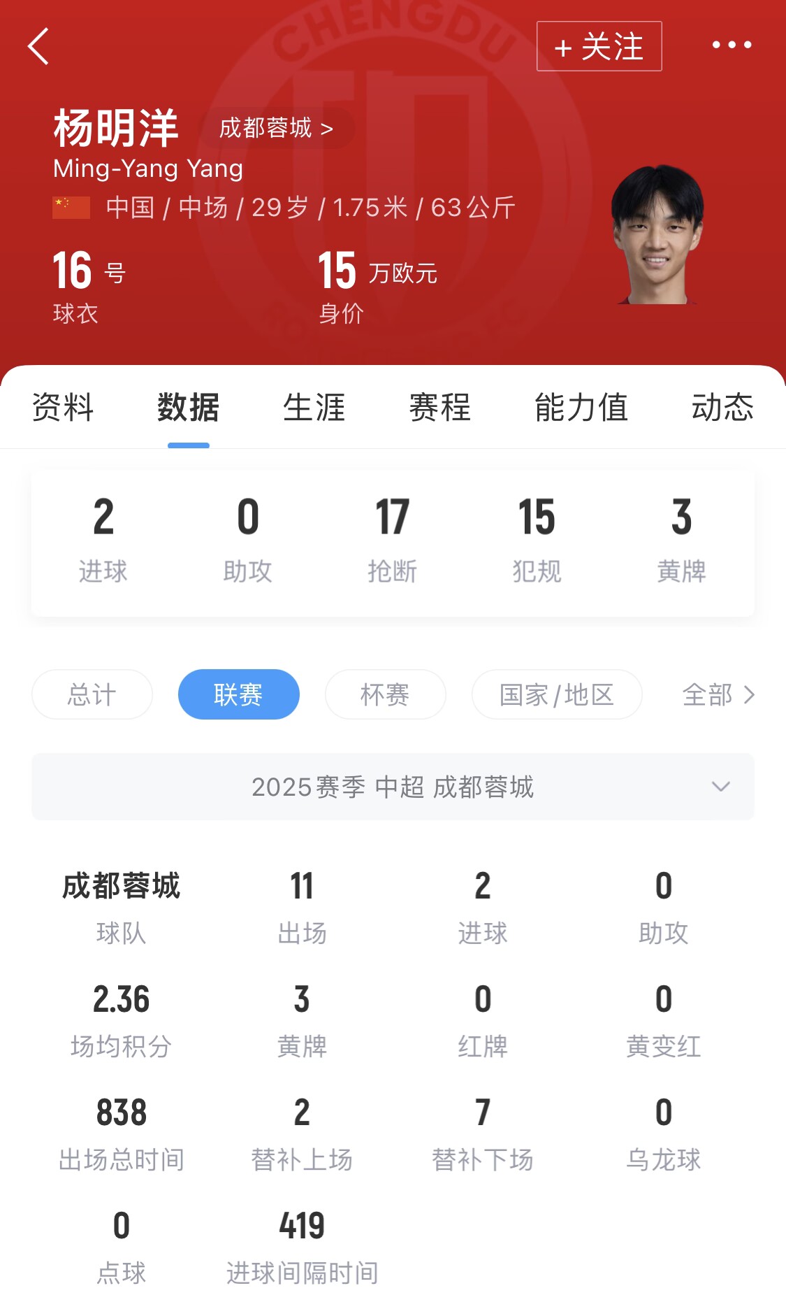 杨明洋1995年7月11日出生于瑞士巴塞尔,现年29岁,祖籍湖北武汉,司职中场,今年2月从南通支云转会成都蓉城。