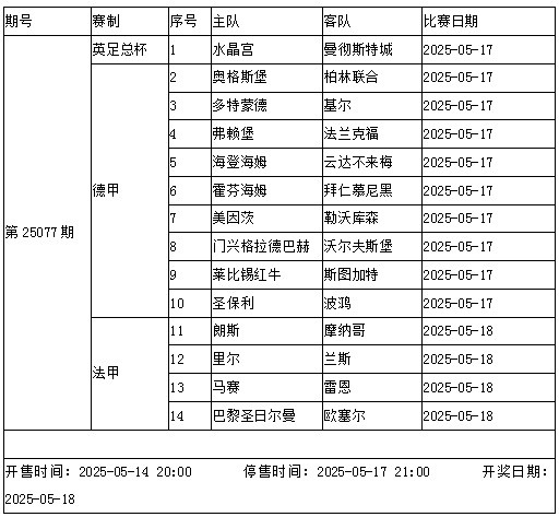 传足胜负彩第25075期竞猜对阵为英足总杯决赛以及德甲法甲收官战。水晶宫PK曼城争夺英足总杯冠军,拜仁慕尼黑和巴黎圣日尔曼分别提前在德甲和法甲夺冠。
