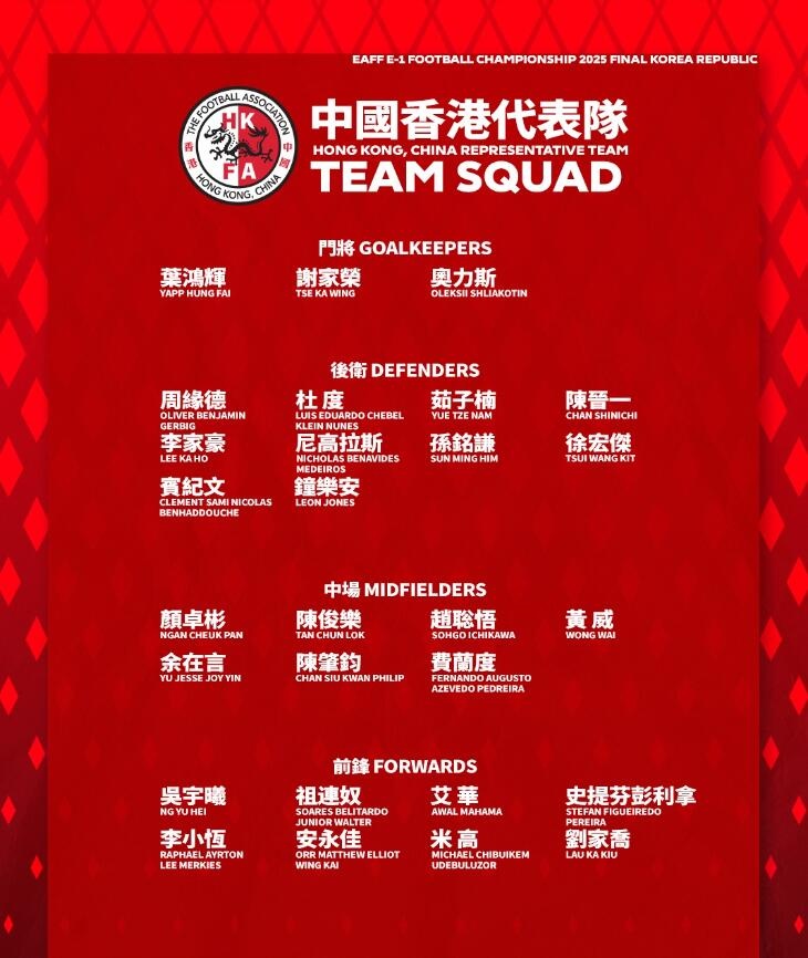 中国香港东亚杯名单:9人来自中超中甲联赛,安永佳、陈晋一领衔