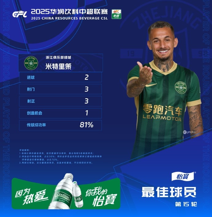 首秀贡献2球1助,浙江队新外援米特里策当选中超第15轮最佳球员