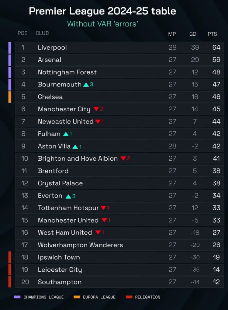 3月2日讯 本赛季英超VAR判罚多次引发争议,数据机构squakwa则列出了如果没有VAR“犯错”的英超本赛季积分榜情况。若无VAR“犯错”英超积分...